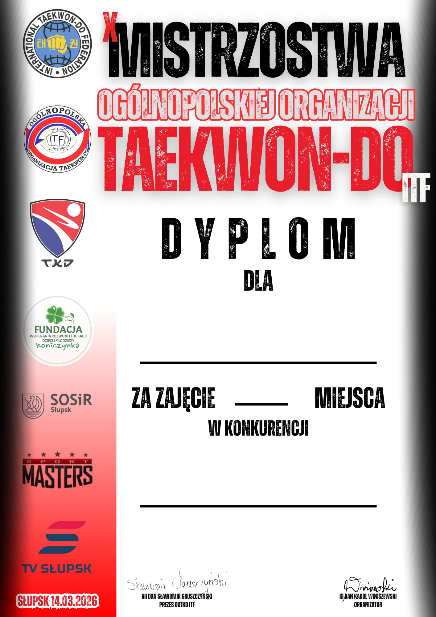 Szanowne koleżanki, szanowni koledzy, dnia 14-go marca (sobota) 2026 roku, w Słupsku, odbędą się X Ogólnopolskie Mistrzostwa Taekwon-do ITF.